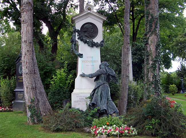 Im September 1889 wurde das Wiener Volkstheater mit Anzengrubers Stück Der Fleck auf der Ehr eröffnet. Es gab viele Ehrungen für den Dramatiker; und sein Name wurde zwischen Nestroy und Raimund an die Wand des Theatergebäudes geschrieben. "Jetzt steh ich zwischen zwei Toten - da werd ich auch bald drankommen", soll Anzengruber damals gesagt haben. Wenige Monate später, kurz nach seinem fünfzigsten Geburtstag, starb er an einer Blutvergiftung. |