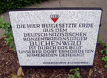 Die hier beigesetzte Erde aus dem deutsch-nazistischen Konzentrationslager Buchenwald ist durch das Blut unserer dort ermordeten Kameraden geheiligt. Lagergruppe Buchenwald |