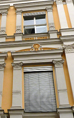 Über den Balkonen und Fenstern der ersten Etage