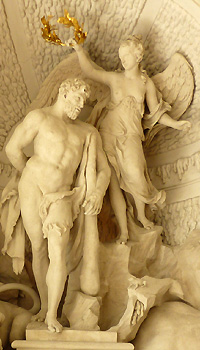 Über den ganzen Mittelrisalit erhebt sich eine balusterbekrönte, durch Figuren geschmückte Attika. |