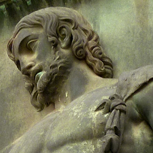 Frauengestalt. In ihrer rechten Hand hält sie eine Schriftrolle,