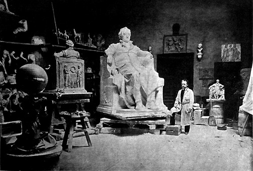Hellmer in seinem Atelier mit Goethe-Denkmal, links Modell (Rückseite) |