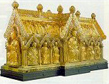 Der Marienschrein entstand am Übergang von der Romanik zu Gotik zwischen 1220 und 1239. In ihm werden seit seiner Fertigstellung die vier großen Heiligtümer Aachens, die Windeln und das Lendentuch Jesu, das Kleid Mariens und das Enthauptungstuch Johannes des Täufers aufbewahrt. Seit dem Pestjahr 1349 wird der Schrein alle sieben Jahre bei Prozessionen mitgeführt und geöffnet. Goldschmiede brauchten 20 Jahre in ihrer mittelalterlichen Werkstatt, bis der Schrein fertig war. |