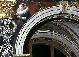 Die lautenspielende Symbolfigur ist eine Umsetzung der Tizianischen Violante. Der ihr über die Schulter blickende Putto mit einem aufgeschlagenem Notenblatt verfolgt ihr Spiel. Als männliches Pendant fungiert Alessandro Farnese, Herzog von Parma und Piacenza, in seinem prachtvoll getriebenen Prunkharnisch des Mailänder Meisters Lucio Piccinino. |